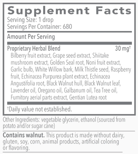 Biocidin® is a synergistic combination of botanicals which target the entire GI tract and supports microbiome balance for healthy digestion and elimination. The botanicals also have systemic applications in microbial challenges wherever they occur. Independent laboratory testing has concluded that Biocidin® has broad reaching effects, including addressing biofilms. Includes botanicals to assist detoxification pathways and to address inflammation.