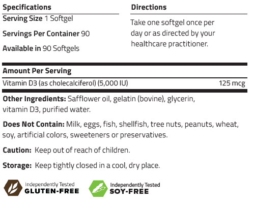 D3-5000™ is a natural, soy free, bioidentical vitamin D supplement. Vitamin D, considered both a hormone and a vitamin, is manufactured in response to skin's exposure to sunlight and is essential to the body’s absorption of calcium. Natural vitamin D3 (cholecalciferol) is four times more potent than synthetic vitamin D2.* In Latin, calciferol means “calcium carrier.” Strong evidence suggests that vitamin D intakes well above current recommendations are beneficial, and when combined with calcium, have a significant impact on overall bone health.* Additionally, vitamin D has been the subject of numerous studies for its effect on the immune system by promoting phagocytosis and immunomodulatory functions.*