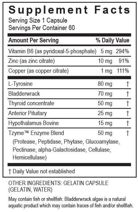 The glandulars used in Thyroid Complex are freeze-dried from clean, safe, disease-free, FDA- and USDA-certified manufacturing facilities, and the manufacturer ensures that the ingredients are Bovine Spongiform Encephalopathy (BSE) free and free from harmful chemicals or pesticides. The animals are bovine from Argentina and New Zealand, and they are in gelatin capsules from a BSE-free porcine source. Health of livestock used for food manufacturing in New Zealand is closely monitored by a world leading biosecurity system that is second to none, and is a global exemplar.